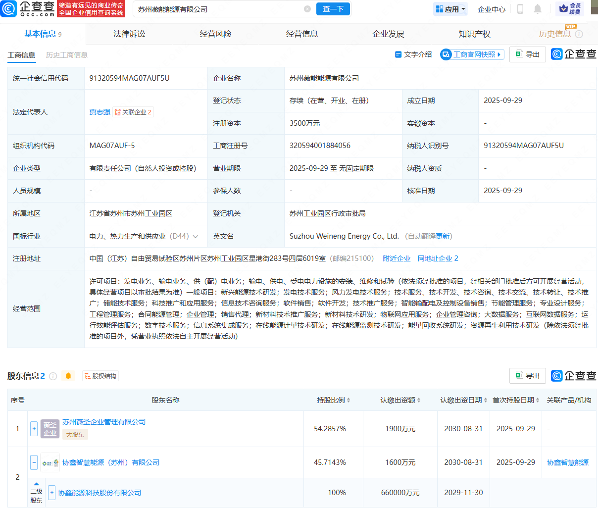 近日,苏州薇能能源有限公司成立,法定代表人为贾志强,注册资本为3500万元,经营范围包含:发电业务、输电业务、供(配)电业务;发电技术服务;储能技术服务;能量回收系统研发等。企查查股权穿透显示全电配资,该公司由苏州薇圣企业管理有限公司、协鑫能科(002015)全资子公司协鑫智慧能源(苏州)有限公司共同持股。