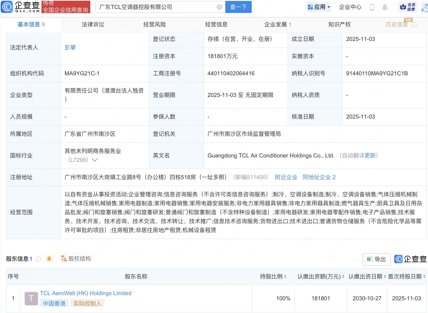 近日,广东TCL空调器控股有限公司成立,法定代表人为彭攀,注册资本约18.18亿人民币,经营范围包括以自有资金从事投资活动、家用电器制造、家用电器研发等。企查查股权穿透显示瑞银投资,该公司由TCLAeroWell(HK)HoldingsLimited全资持股。